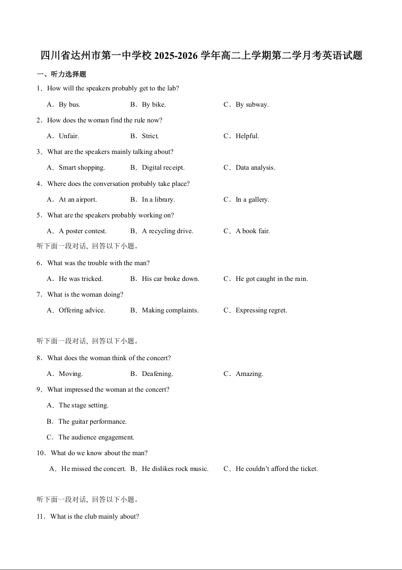 高二英语+答案--四川省达州市第一中学校2025-2026学年高二上学期第二次月考