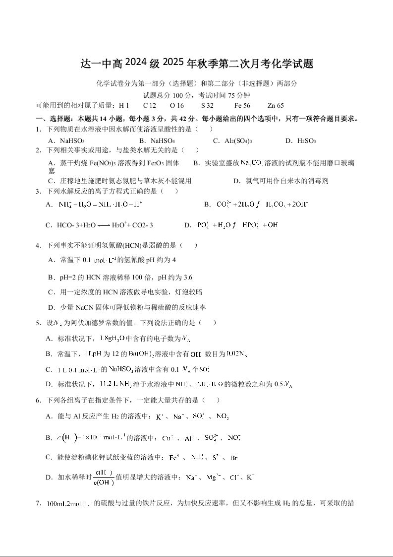 高二化学+答案--四川省达州市第一中学校2025-2026学年高二上学期第二次月考