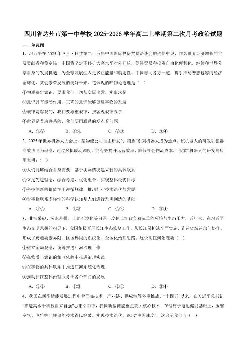 高二政治+答案--四川省达州市第一中学校2025-2026学年高二上学期第二次月考