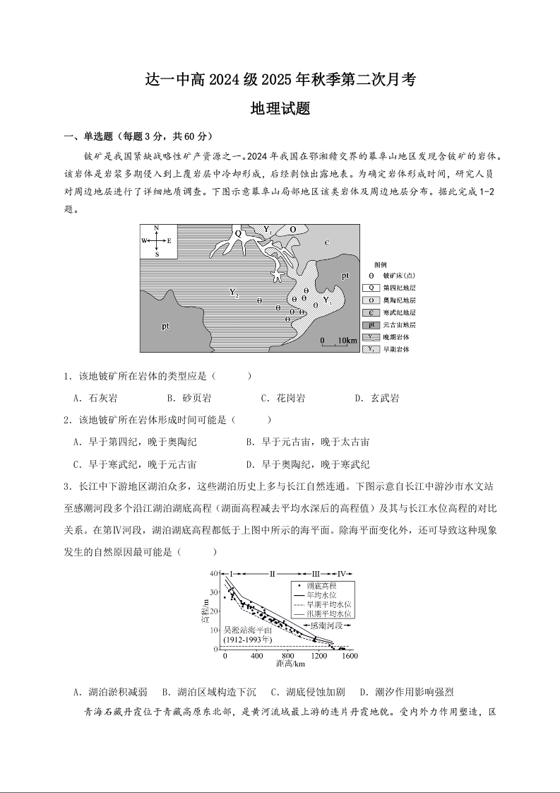 高二地理--四川省达州市第一中学校2025-2026学年高二上学期第二次月考