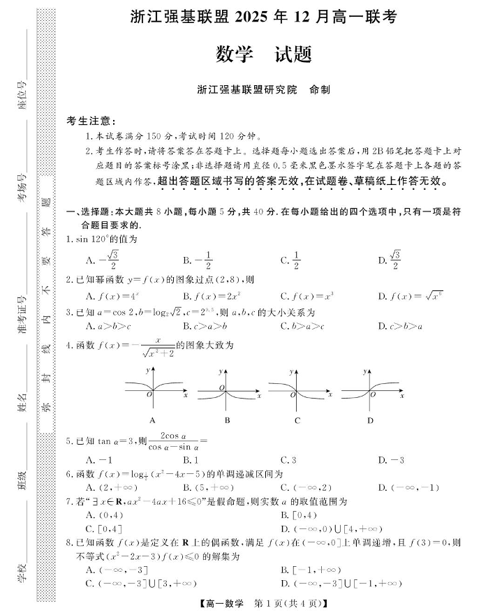 高一数学--浙江省强基联盟2025-2026学年高一上学期12月月考