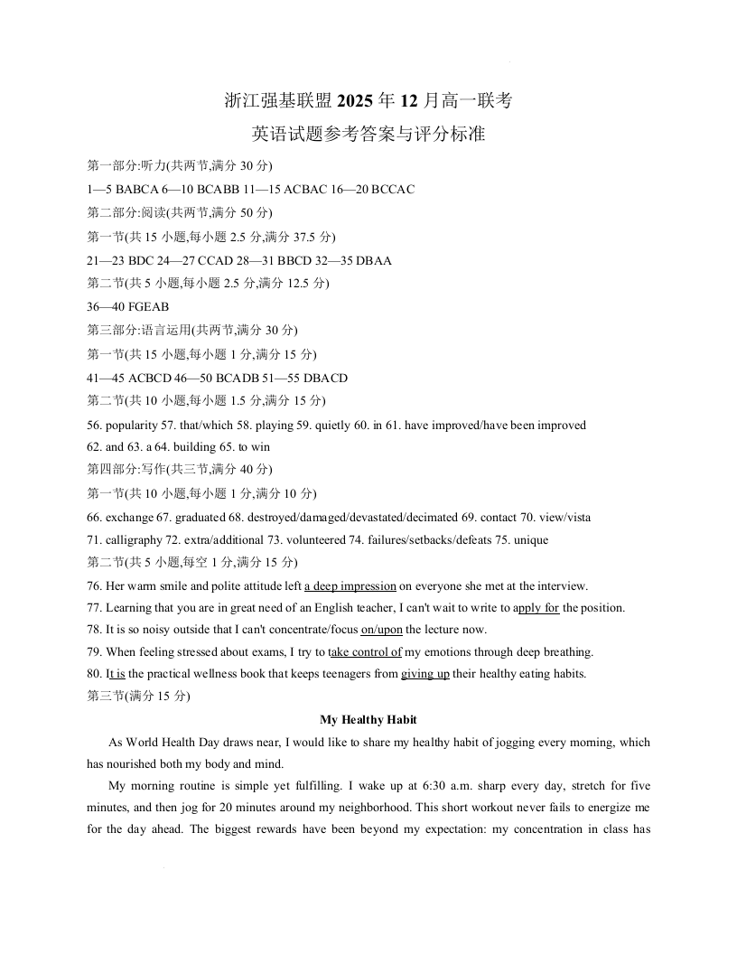 高一英语答案--浙江省强基联盟2025-2026学年高一上学期12月月考