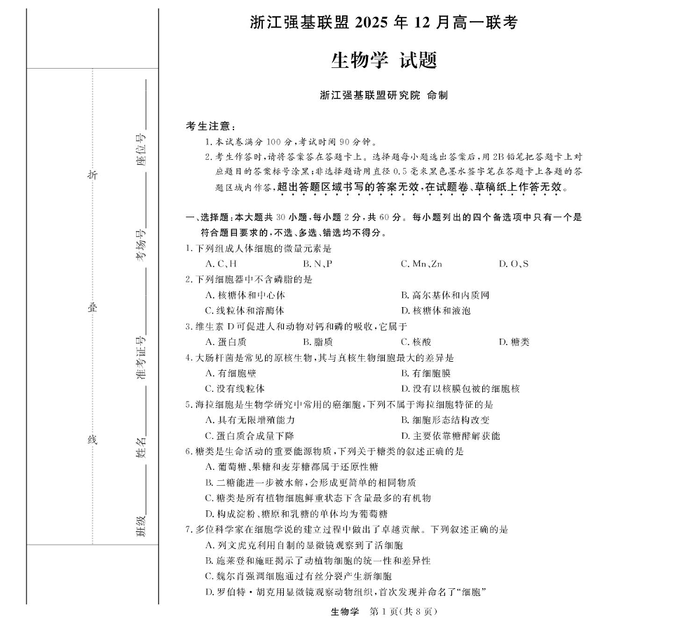 高一生物+答案--浙江省强基联盟2025-2026学年高一上学期12月月考