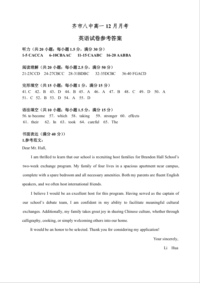 高一英语答案--黑龙江省齐齐哈尔市第八中学校2025-2026学年高一上学期12月月考