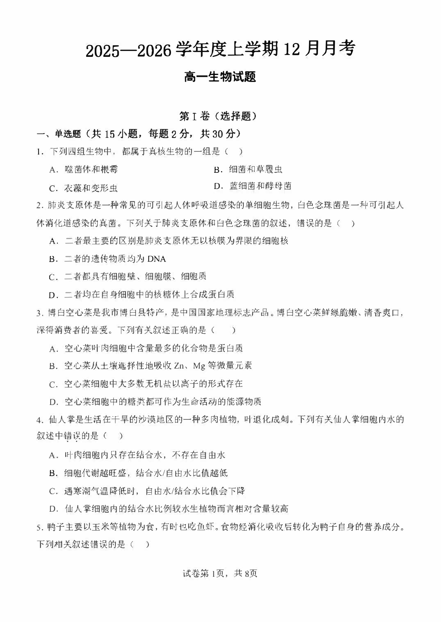 高一生物--黑龙江省齐齐哈尔市第八中学校2025-2026学年高一上学期12月月考