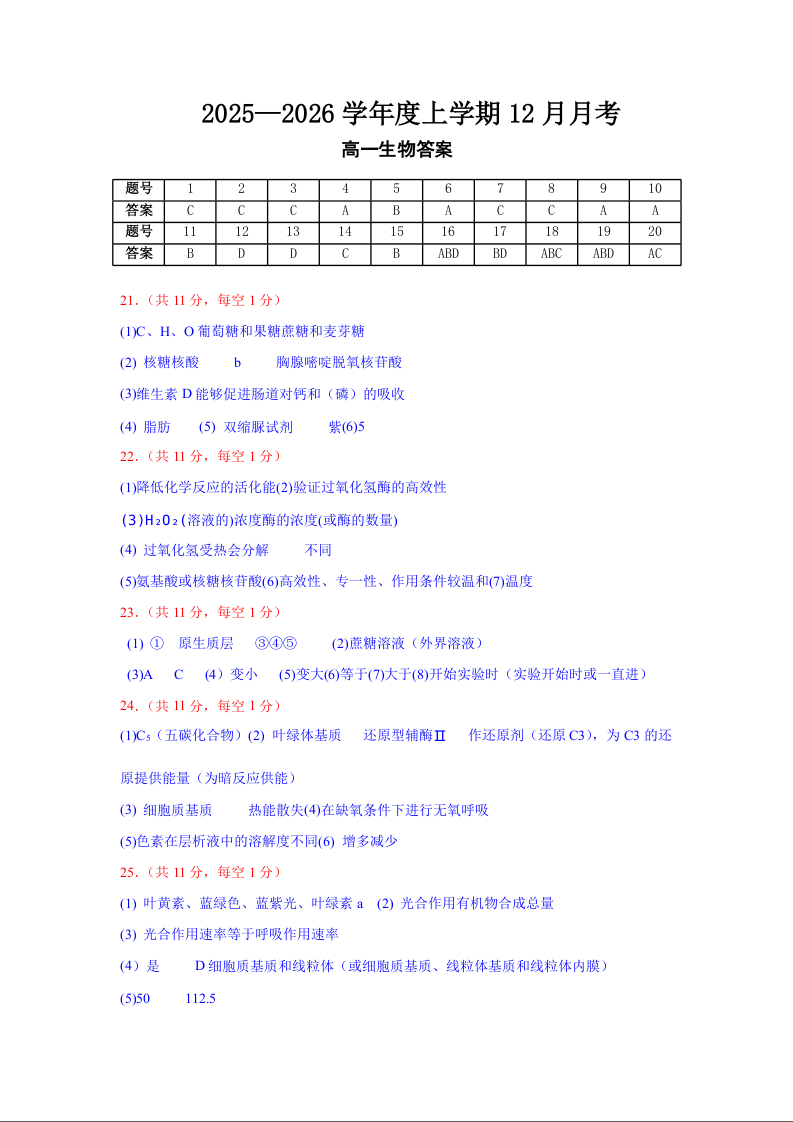 高一生物答案--黑龙江省齐齐哈尔市第八中学校2025-2026学年高一上学期12月月考