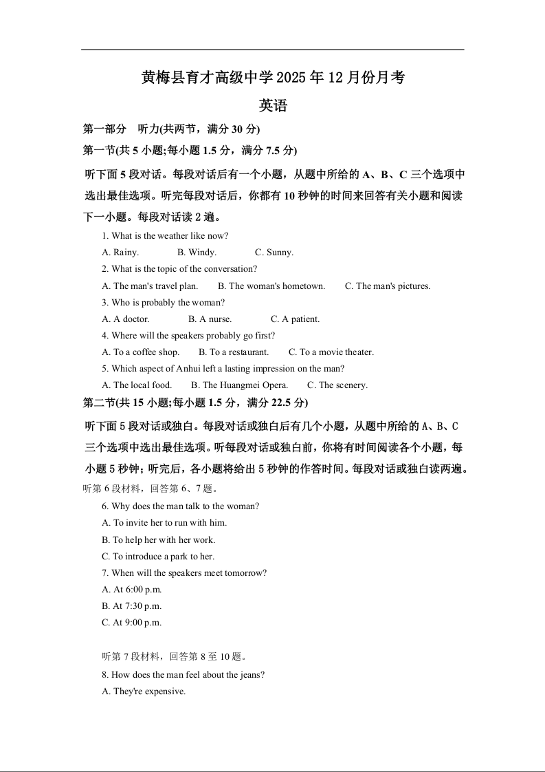 高一英语--湖北省黄冈市黄梅县育才高级中学2025-2026学年高一上学期12月月考
