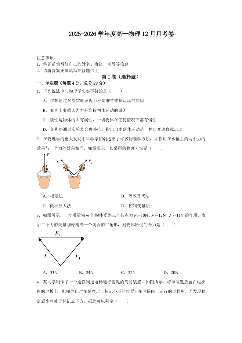 高一物理+答案--湖北省黄冈市黄梅县育才高级中学2025-2026学年高一上学期12月月考