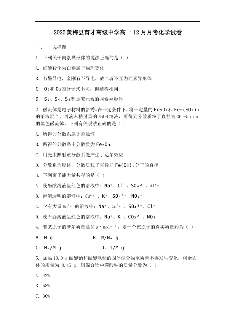 高一化学--湖北省黄冈市黄梅县育才高级中学2025-2026学年高一上学期12月月考