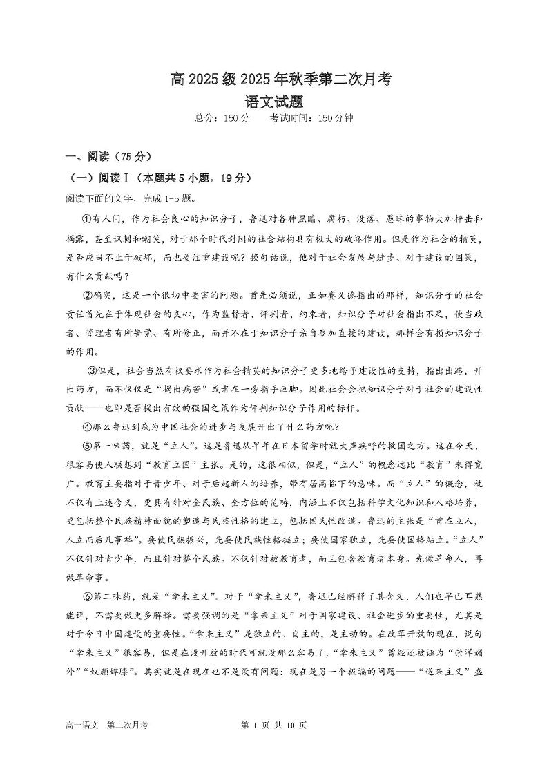 高一语文+答案--四川省达州市第一中学校2025-2026学年高一上学期第二次月考