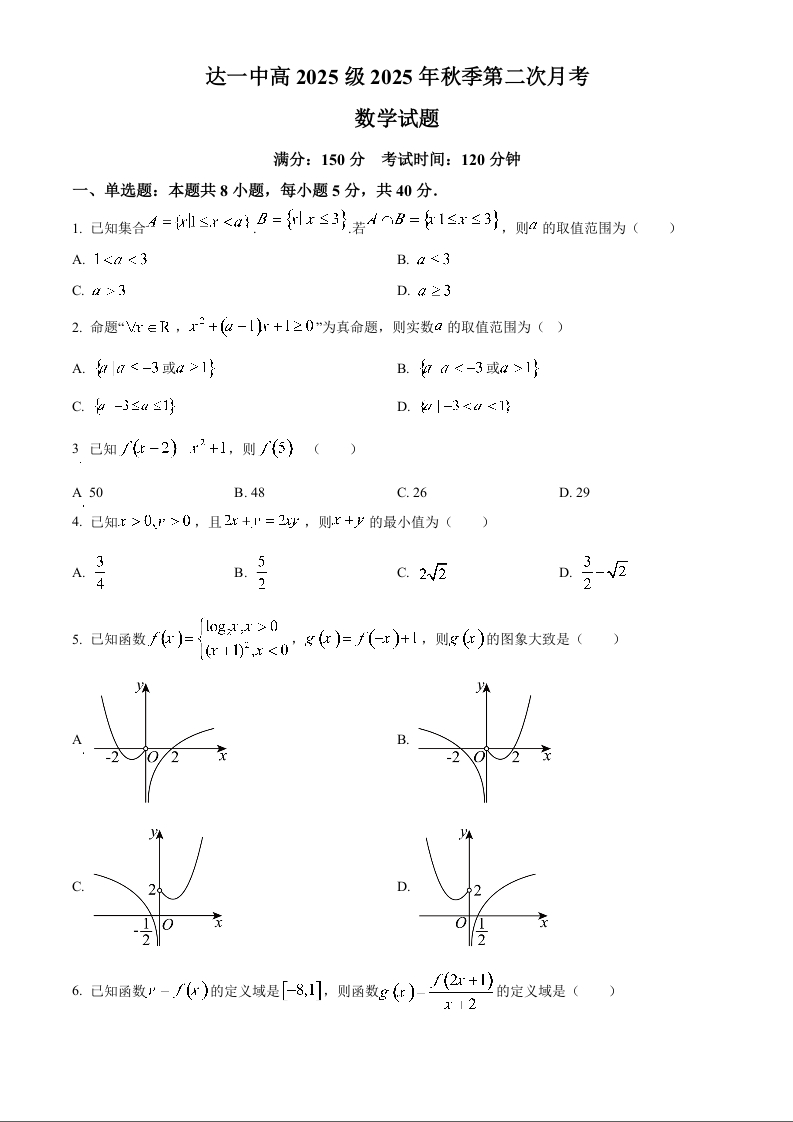 高一数学(原卷版)--四川省达州市第一中学校2025-2026学年高一上学期第二次月考