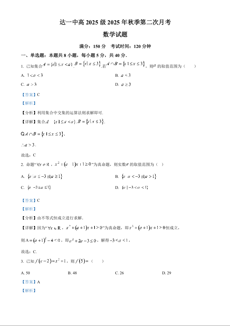 高一数学(精品解析版)--四川省达州市第一中学校2025-2026学年高一上学期第二次月考