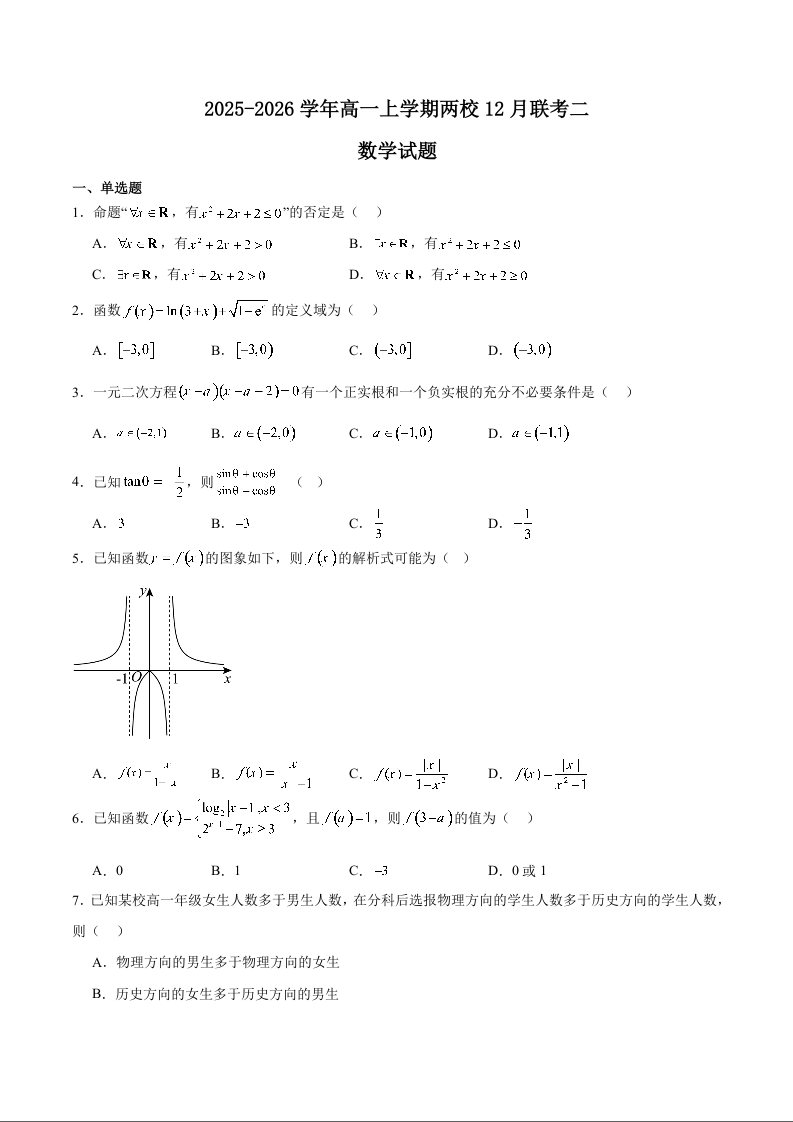 高一数学+答案--福建省泉州市两校2025-2026学年高一上学期12月联考二
