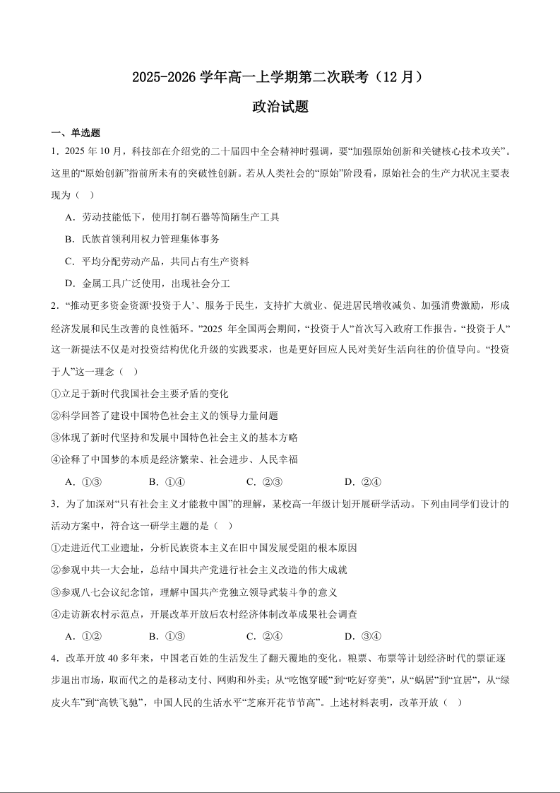 高三政治+答案--高三英语+答案--福建省泉州市两校2025-2026学年高一上学期12月联考二