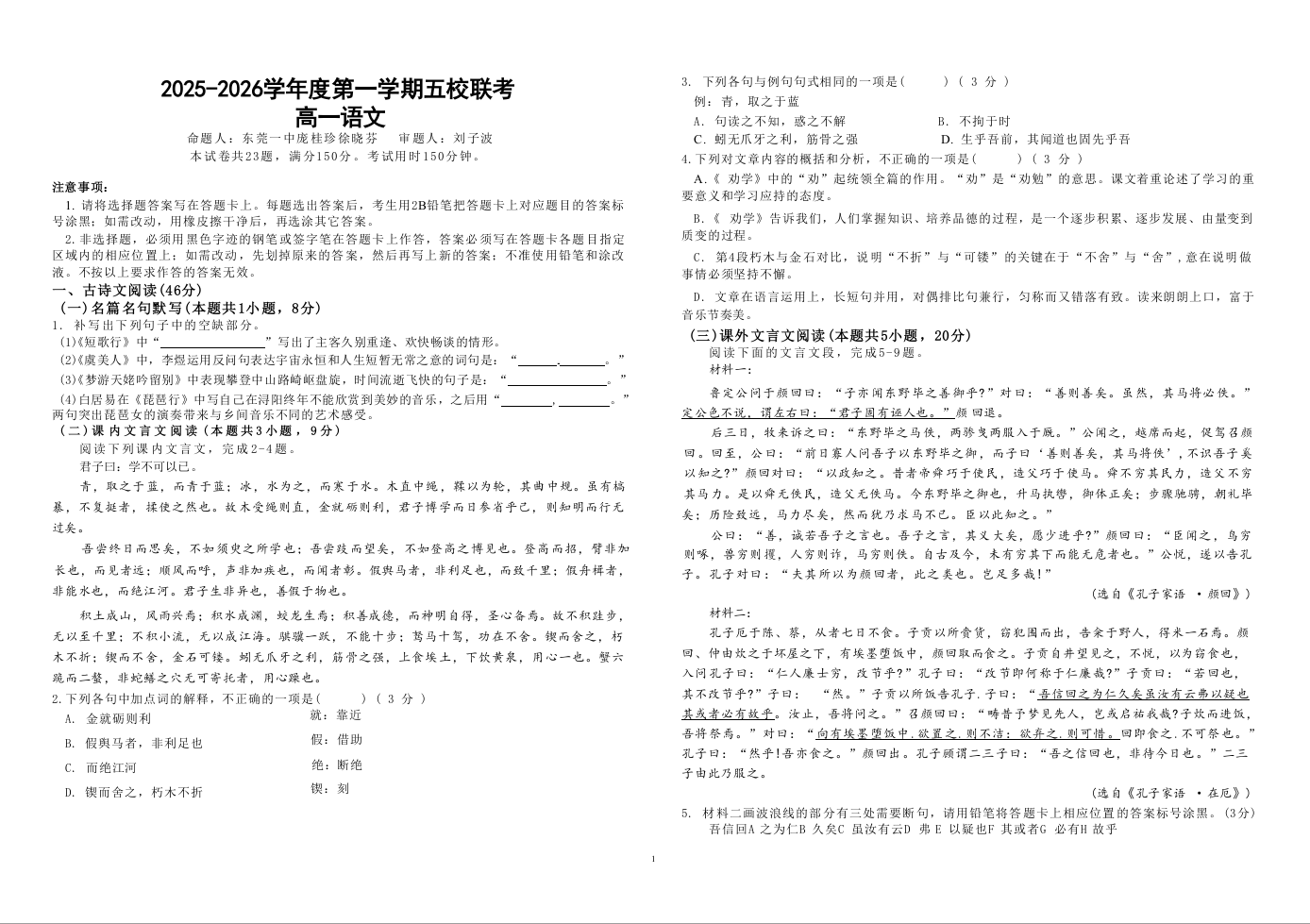高一语文+答案--广东省东莞市五校2025-2026学年高一上学期12月期中考试