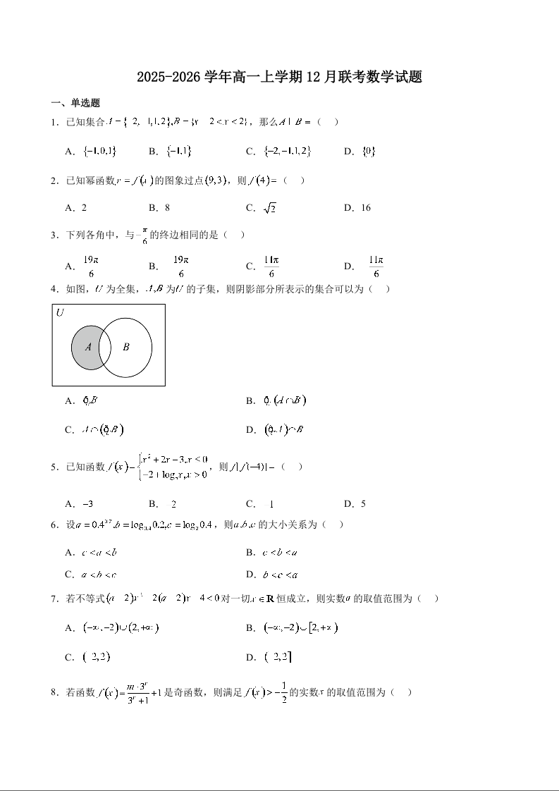 高一数学+答案--广东省东莞市五校2025-2026学年高一上学期12月期中考试