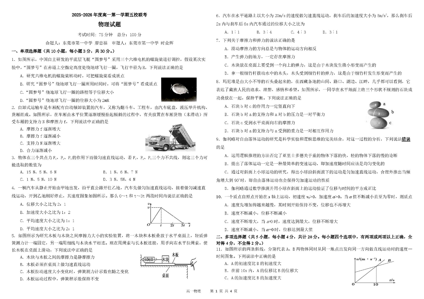 高一物理+答案--广东省东莞市五校2025-2026学年高一上学期12月期中考试