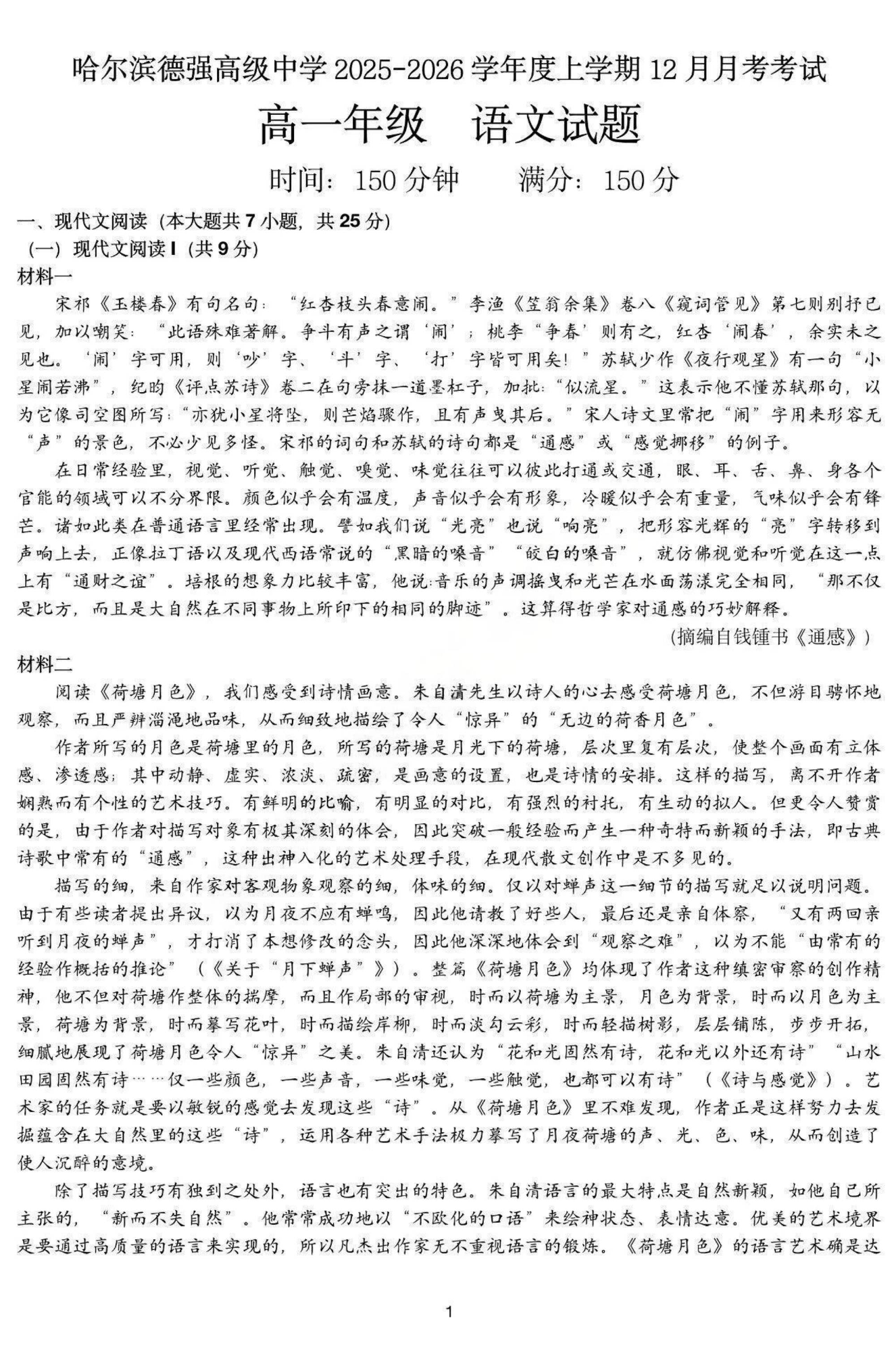 高一语文+答案--黑龙江省哈尔滨德强高级中学2025-2026学年高一上学期12月月考