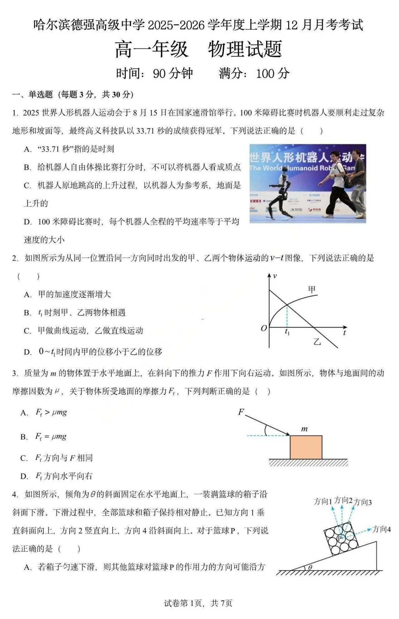 高一物理+答案--黑龙江省哈尔滨德强高级中学2025-2026学年高一上学期12月月考