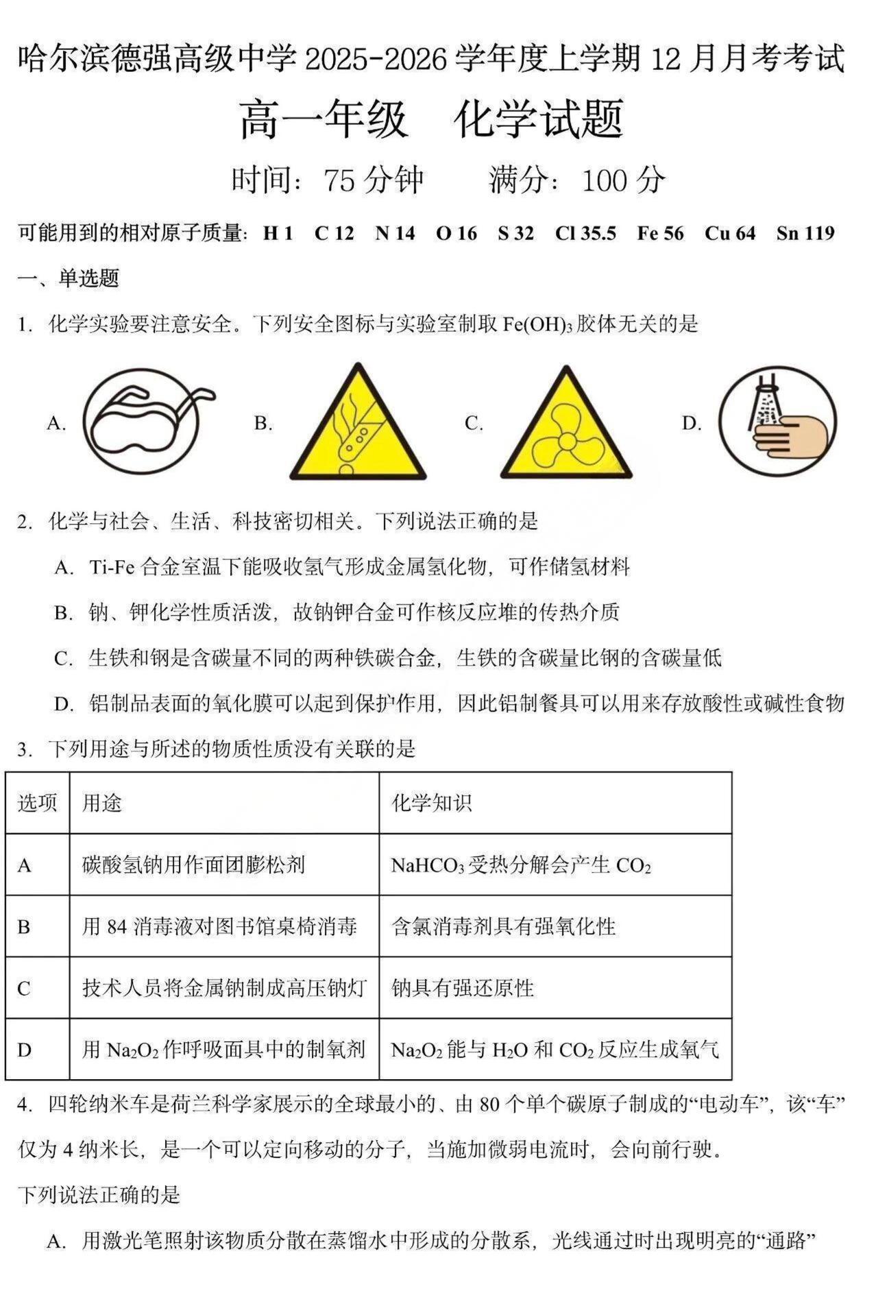 高一化学+答案--黑龙江省哈尔滨德强高级中学2025-2026学年高一上学期12月月考