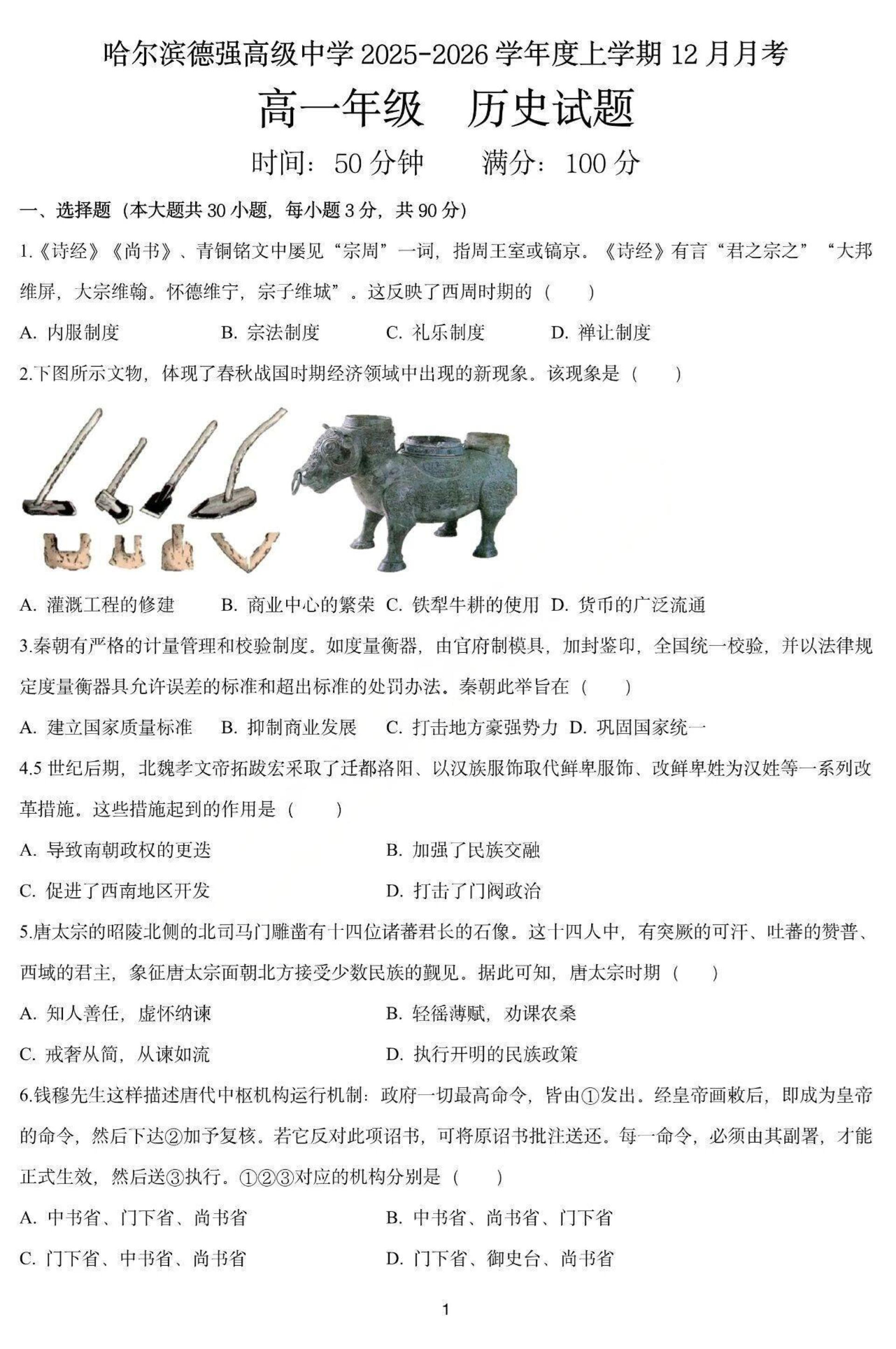 高一历史+答案--黑龙江省哈尔滨德强高级中学2025-2026学年高一上学期12月月考