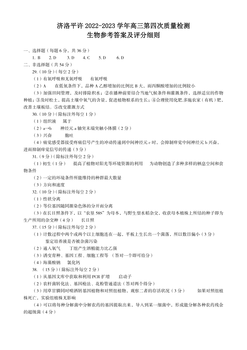 高三生物答案----河南省济洛平许2023届高三第四次质量检测