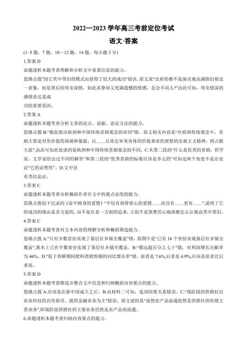 高三语文答案--河南省许平汝名校2023届高三考前定位考试