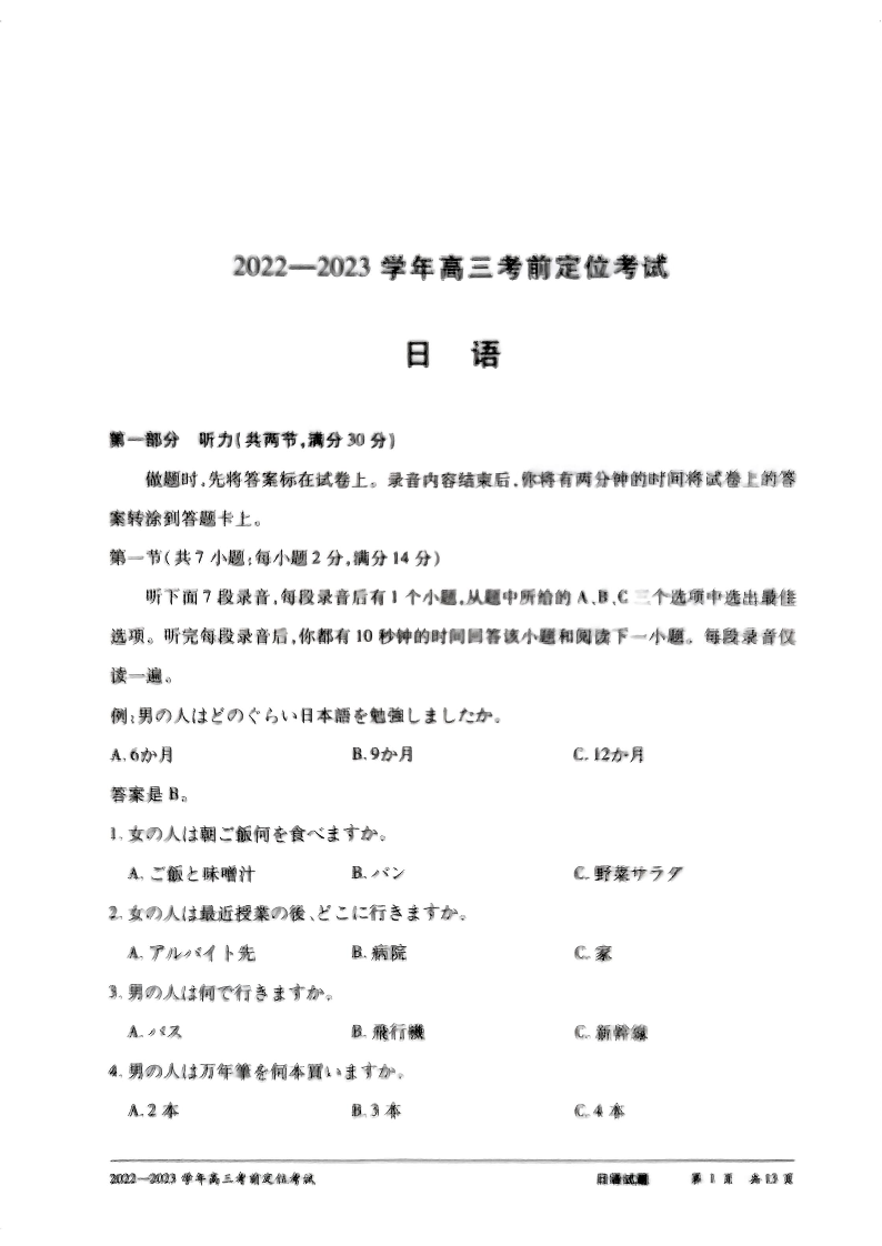 高三日语--河南省许平汝名校2023届高三考前定位考试