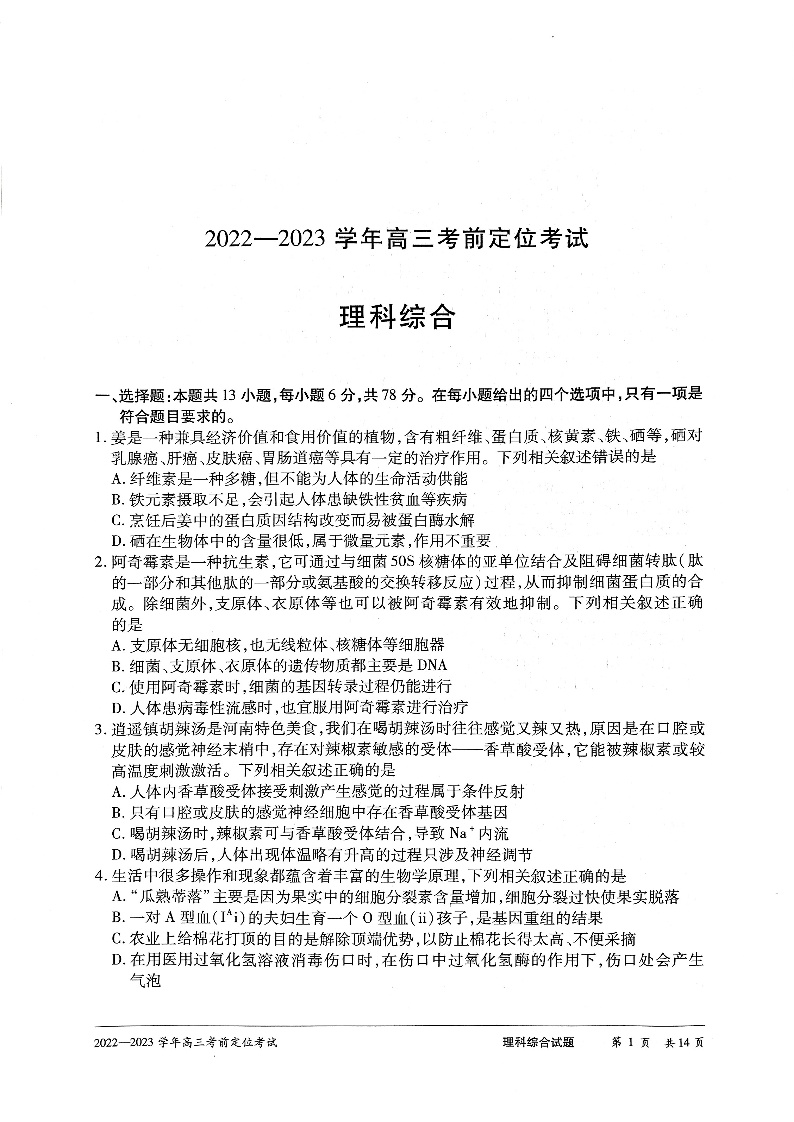 高三理综--河南省许平汝名校2023届高三考前定位考试