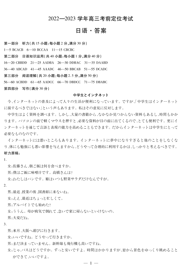 高三日语答案--河南省许平汝名校2023届高三考前定位考试