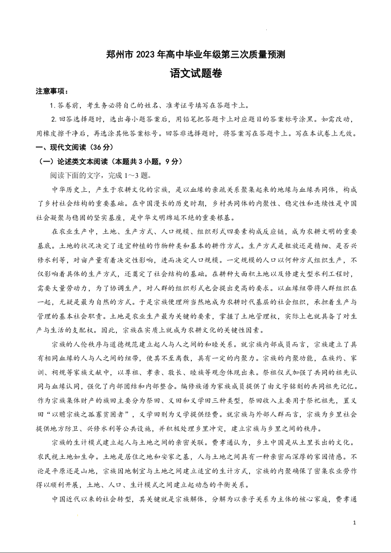 高三语文+答案--河南省郑州市2023届高三第三次质量预测