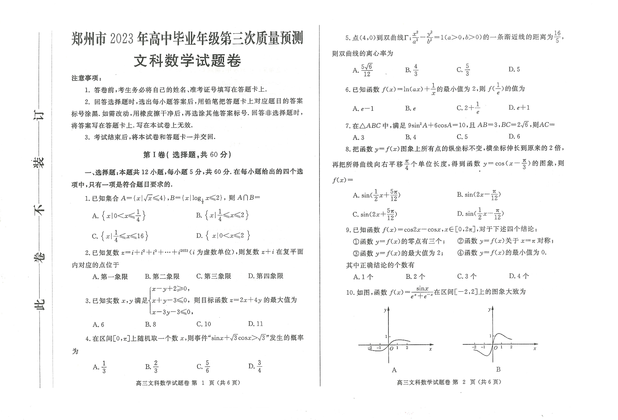高三文数--河南省郑州市2023届高三第三次质量预测