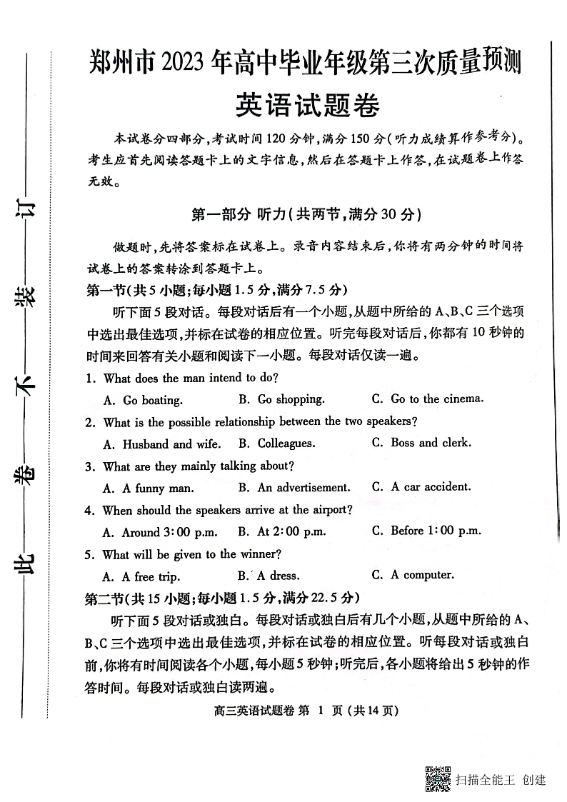 高三英语--河南省郑州市2023届高三第三次质量预测