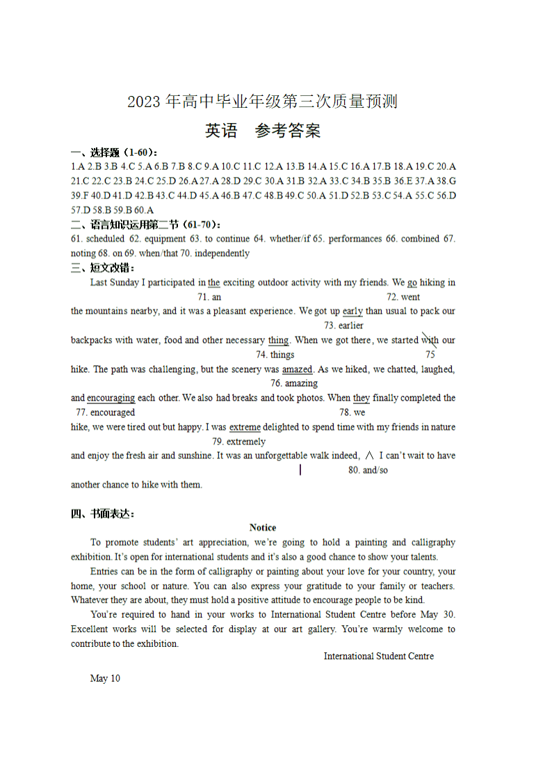 高三英语答案--河南省郑州市2023届高三第三次质量预测