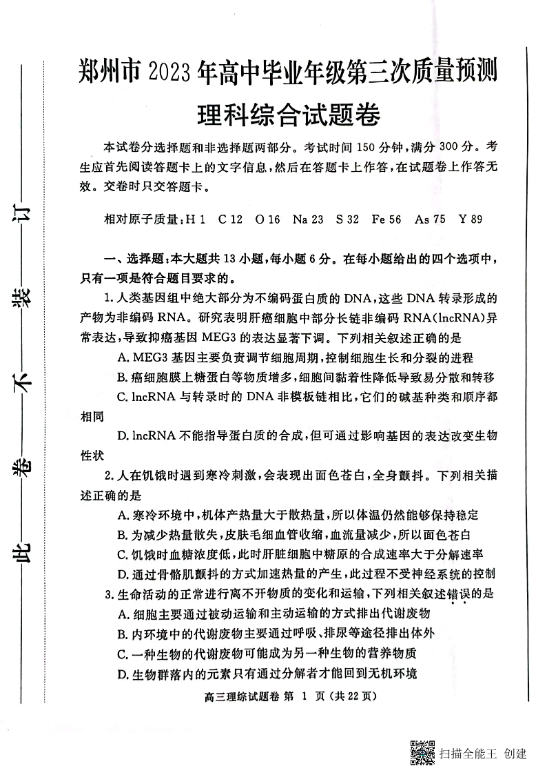 高三理综--河南省郑州市2023届高三第三次质量预测
