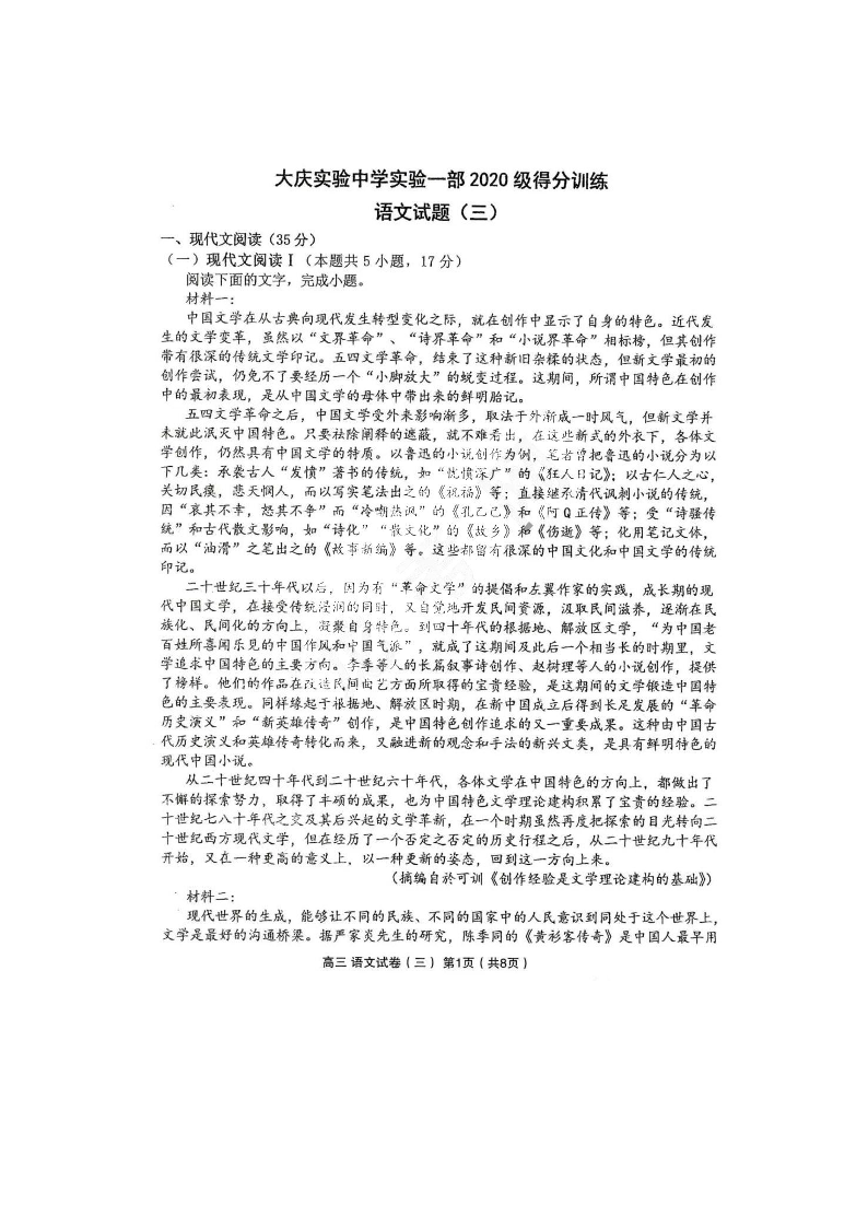 高三语文+答案--黑龙江大庆实验中学2023届高三5月得分训练(三)