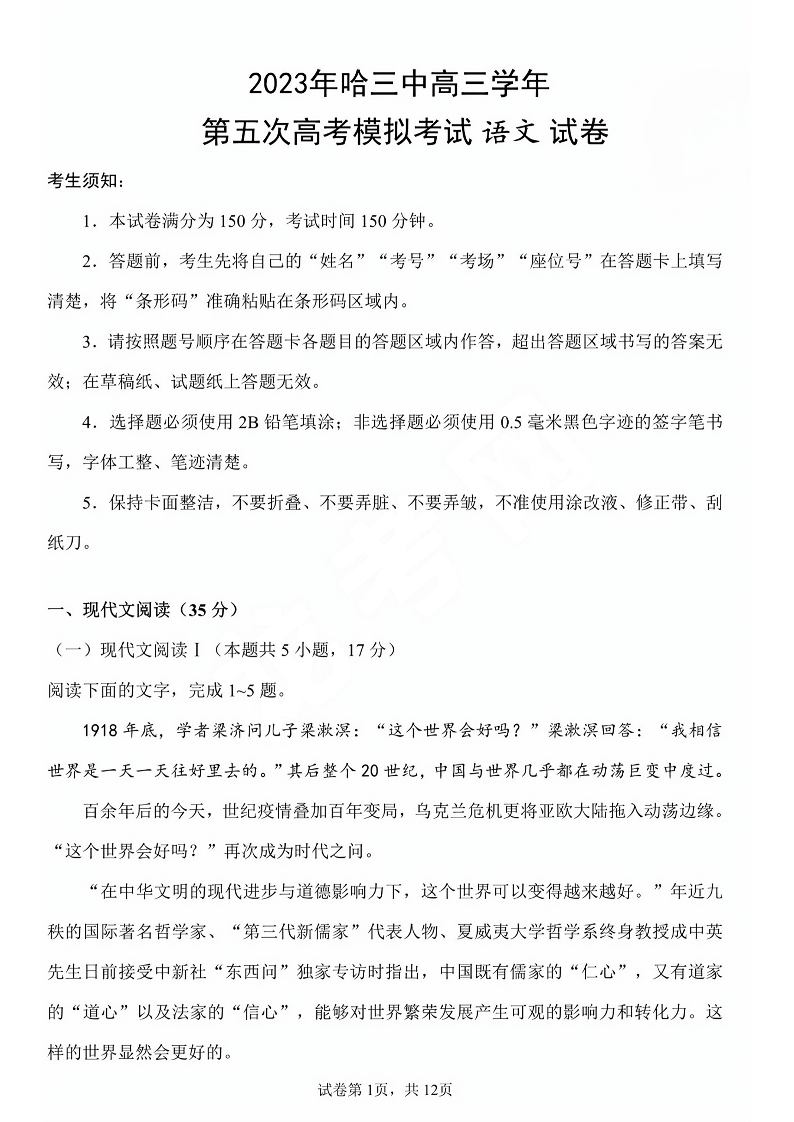 高三语文--黑龙江省哈尔滨市第三中学校2023届高三第五次模拟考试
