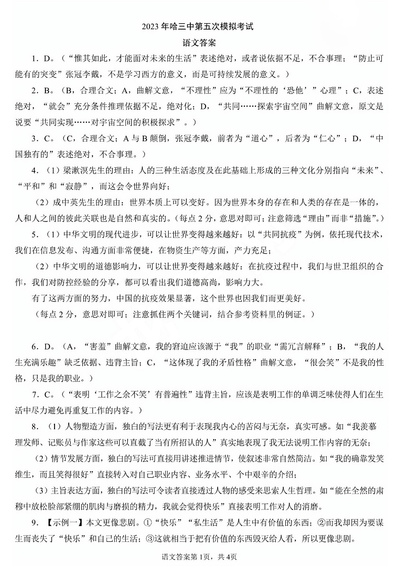 高三语文答案--黑龙江省哈尔滨市第三中学校2023届高三第五次模拟考试