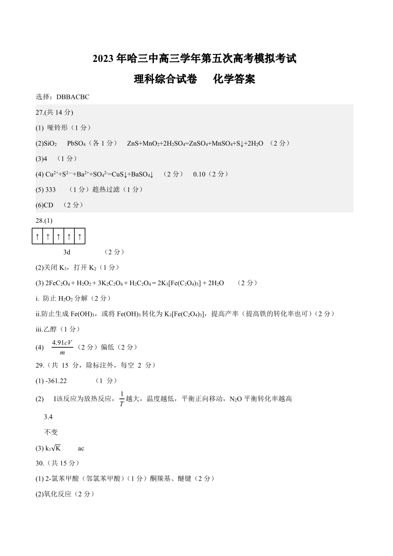 高三化学答案--黑龙江省哈尔滨市第三中学校2023届高三第五次模拟考试