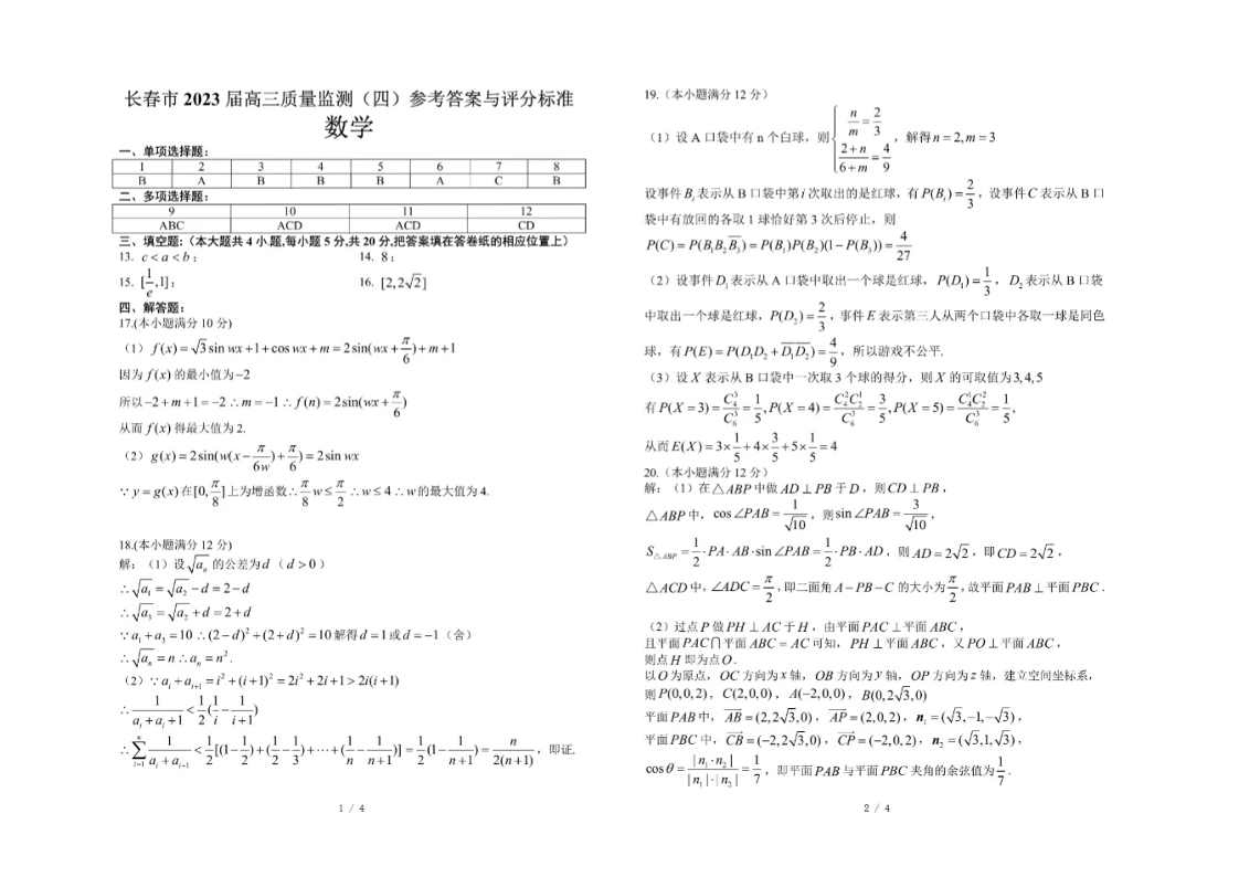 高三数学答案--吉林省长春市2023届高三质量监测(四)