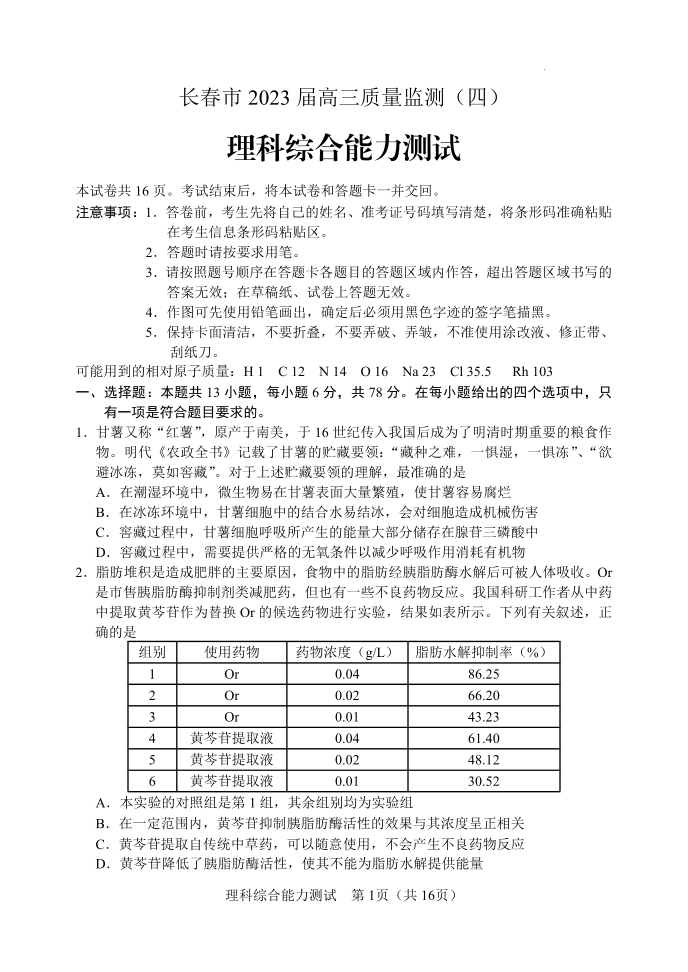 高三理综--吉林省长春市2023届高三质量监测(四)