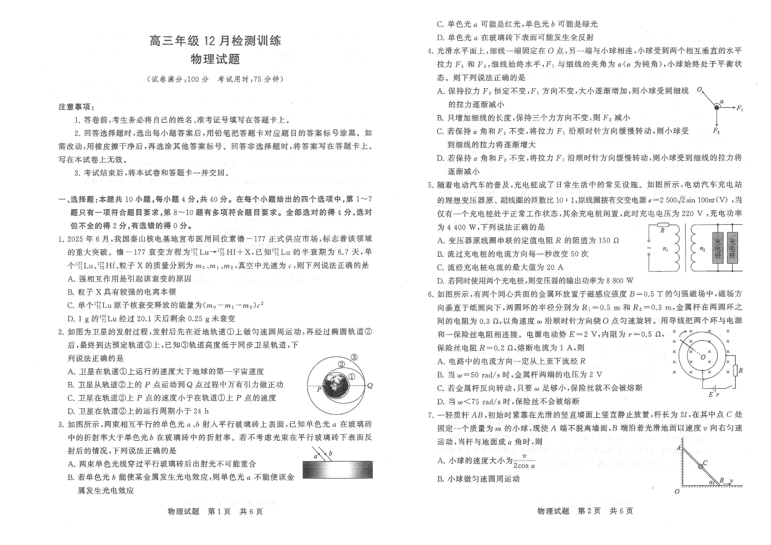 高三物理--湖北省2026届高三年级12月检测训练(T8联考)