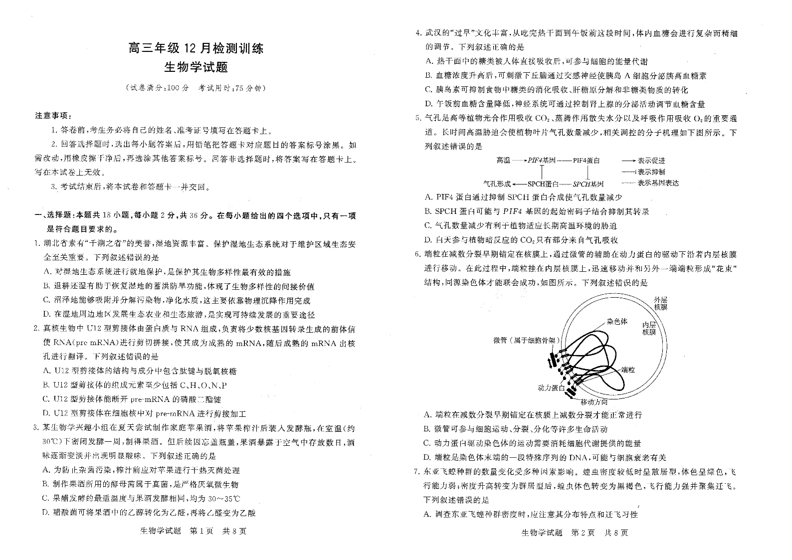 高三生物--湖北省2026届高三年级12月检测训练(T8联考)