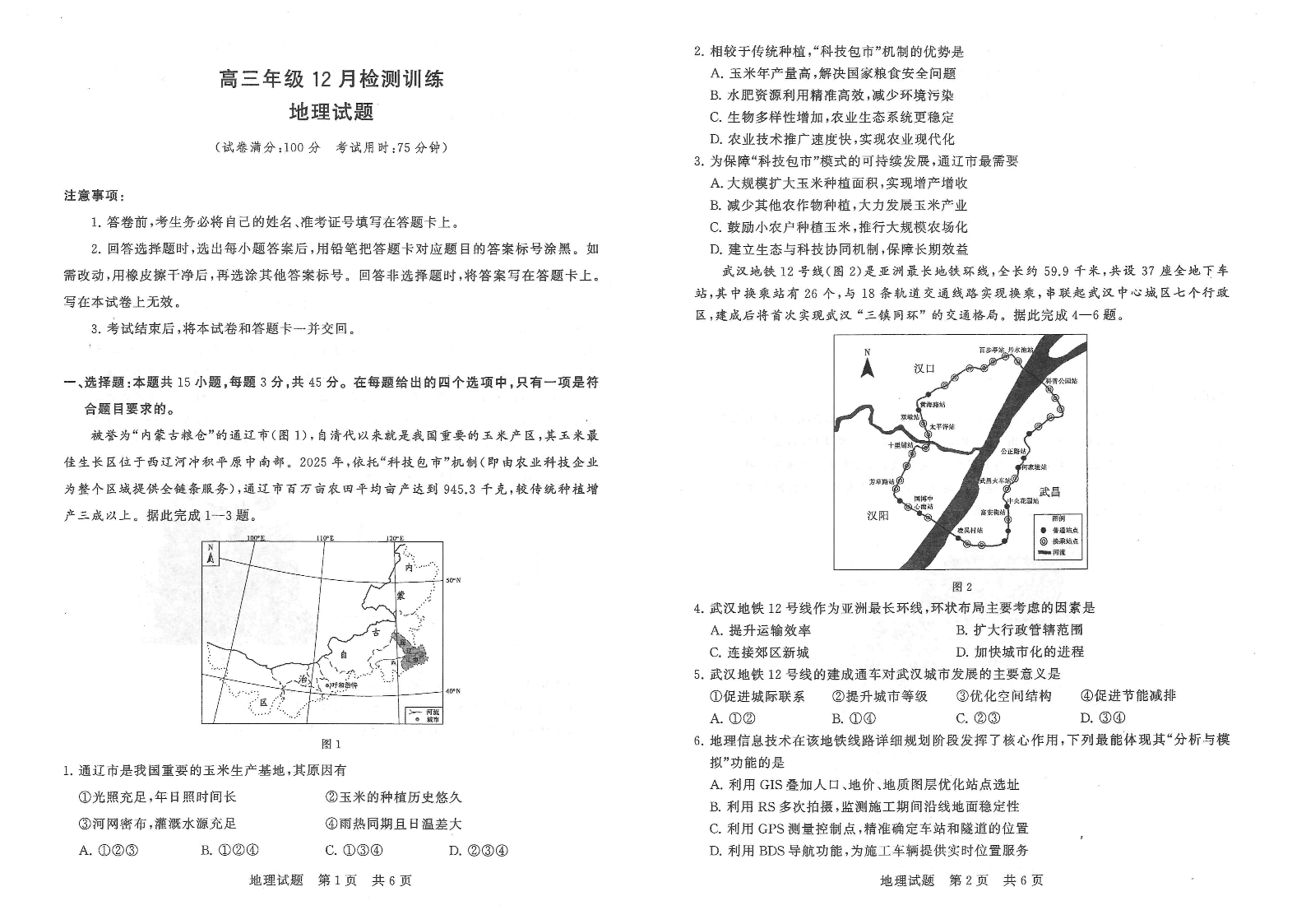 高三地理--湖北省2026届高三年级12月检测训练(T8联考)