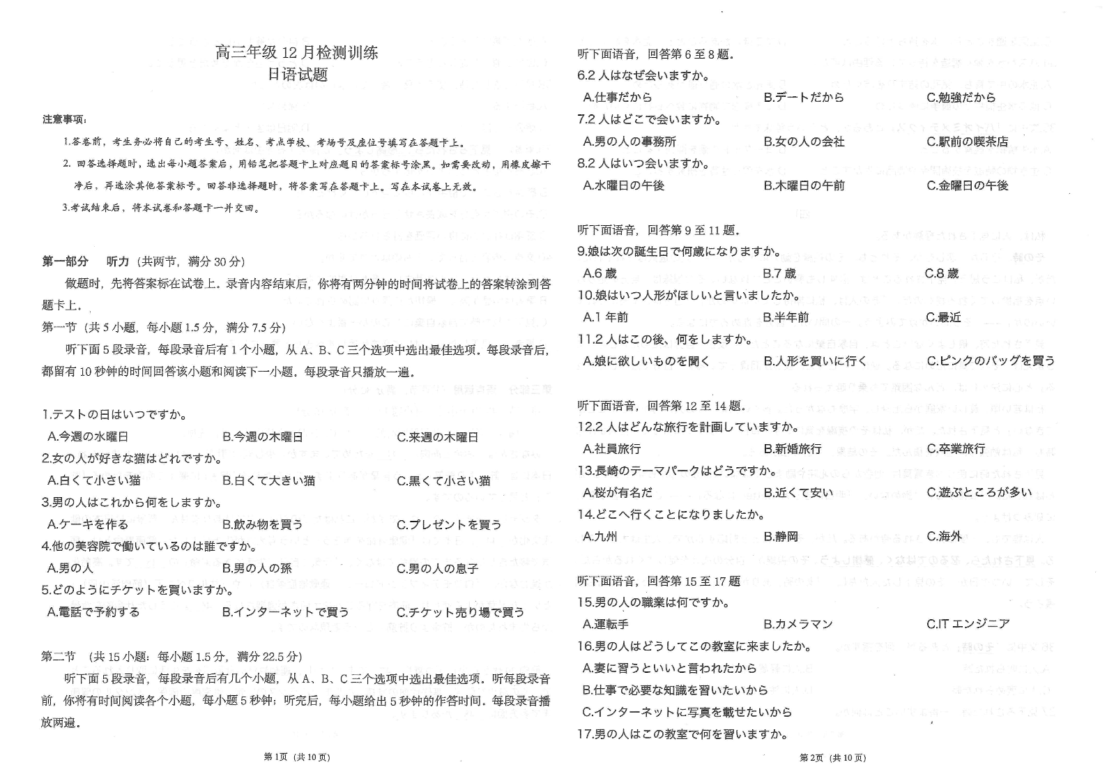 高三日语--湖北省2026届高三年级12月检测训练(T8联考)