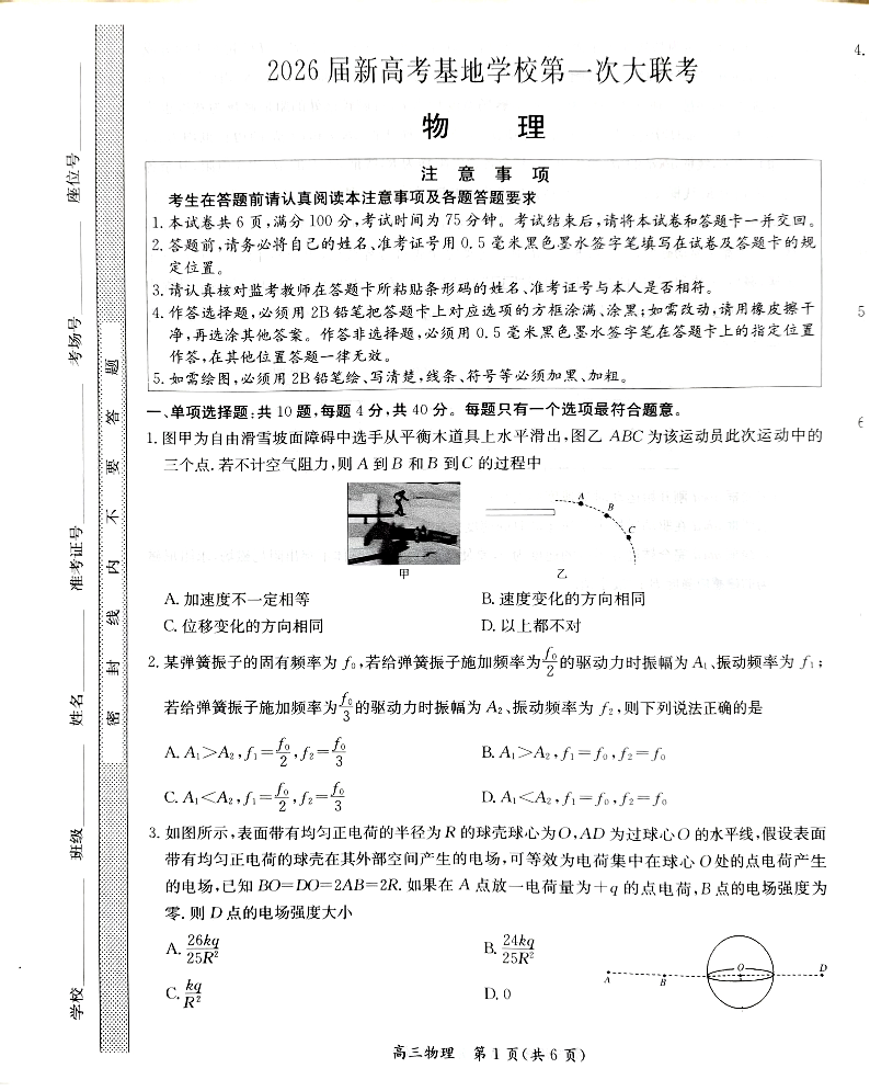 高三物理--江苏省新高考基地学校2026届高三上学期第一次大联考