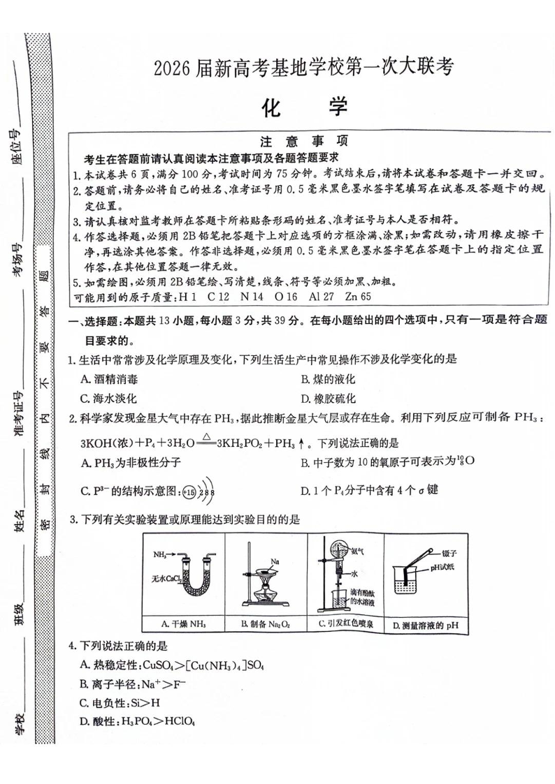 高三化学+答案--江苏省新高考基地学校2026届高三上学期第一次大联考