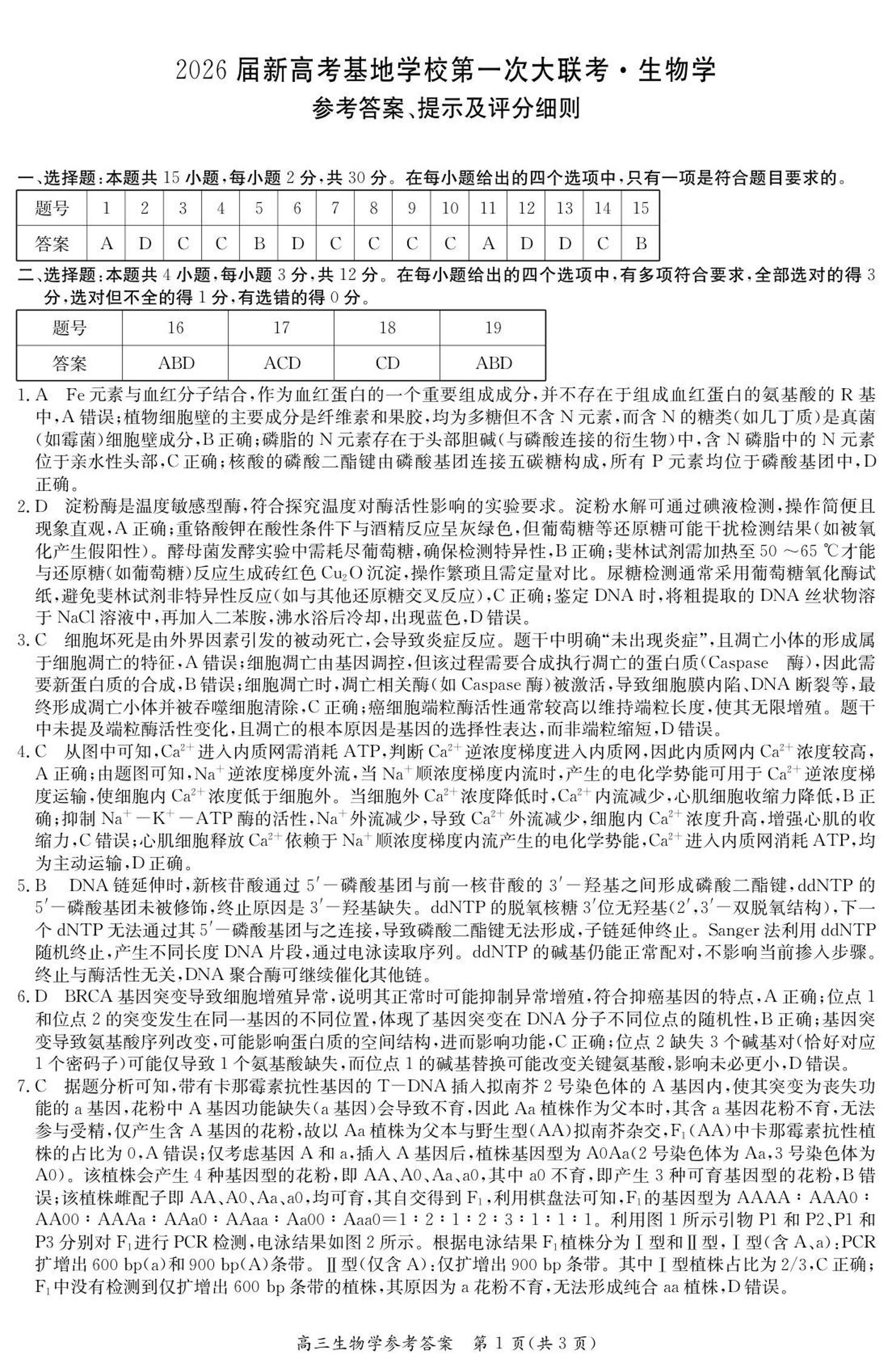 高三生物答案--江苏省新高考基地学校2026届高三上学期第一次大联考