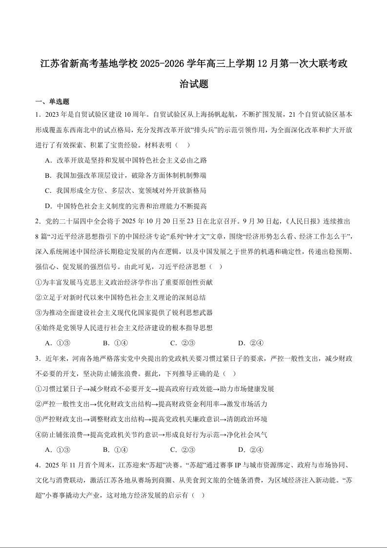 高三政治+答案--江苏省新高考基地学校2026届高三上学期第一次大联考