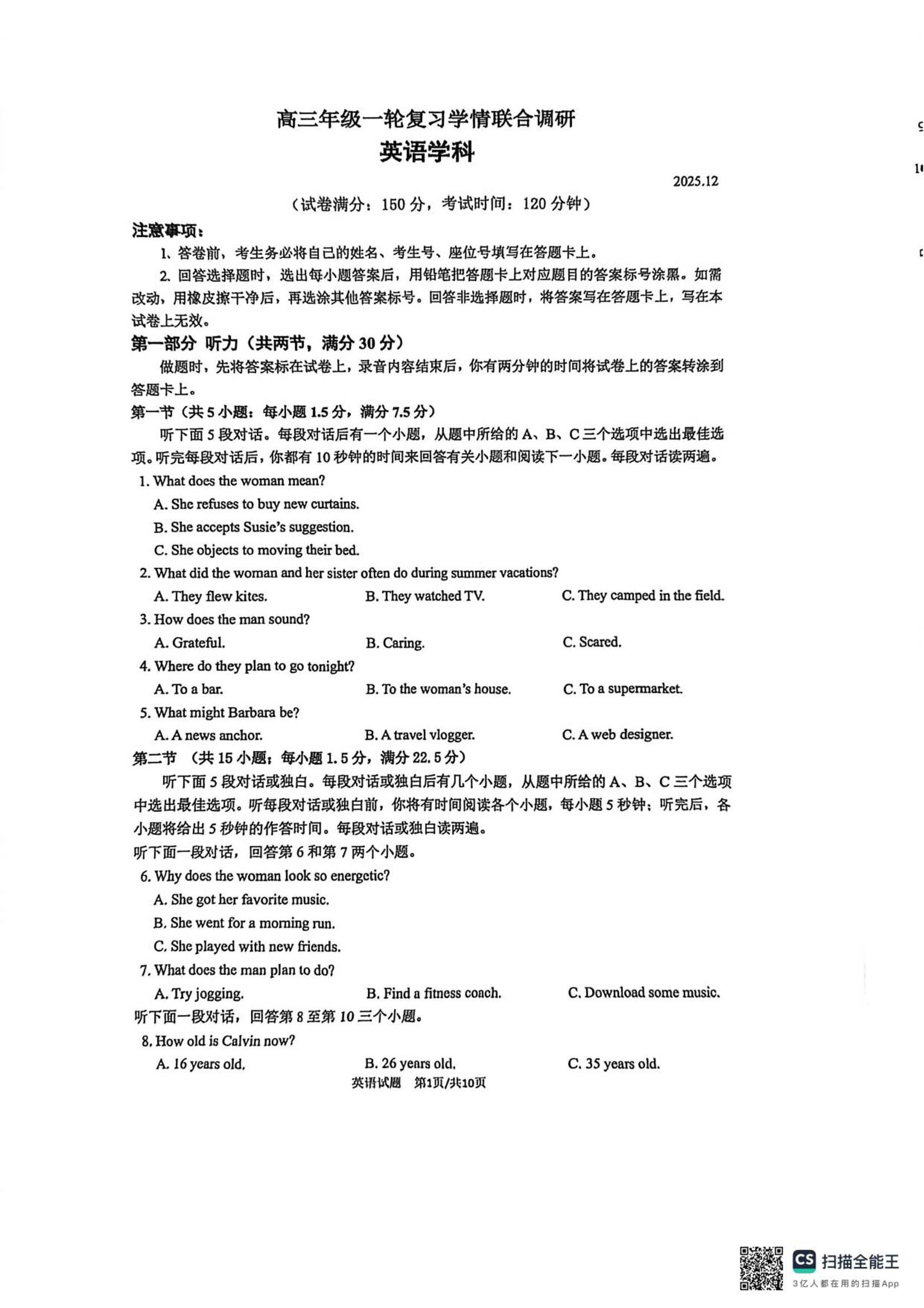 高三英语--苏州九校2026届高三上学期一轮复习学情联合调研
